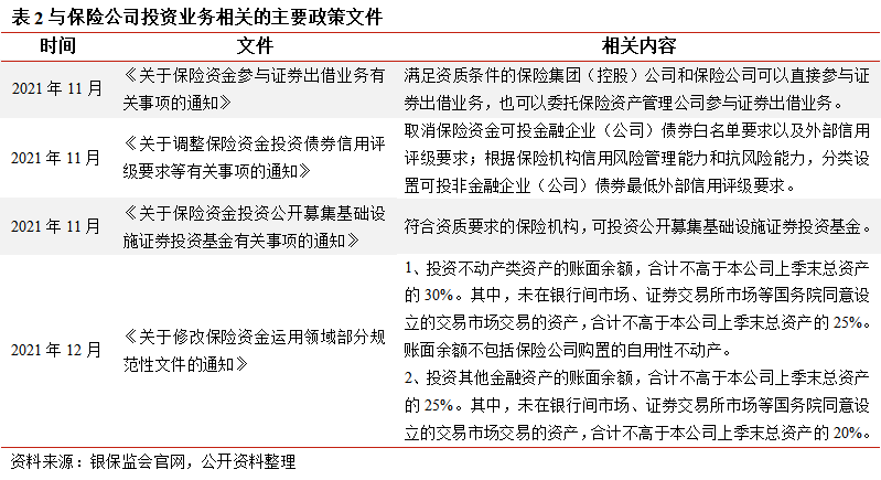 投資業(yè)務(wù)方面,2021年以來(lái)保險(xiǎn)資金運(yùn)用范圍得到進(jìn)一步拓展,監(jiān)管機(jī)構(gòu)引導(dǎo)保險(xiǎn)資金加大標(biāo)準(zhǔn)化產(chǎn)品投資力度。監(jiān)管機(jī)構(gòu)允許符合要求的保險(xiǎn)資金參與證券出借業(yè)務(wù),投資公開(kāi)募集基礎(chǔ)設(shè)施證券投資基金;取消保險(xiǎn)資金可投金融企業(yè)(公司)債券白名單要求以及外部信用評(píng)級(jí)要求,有利于拓寬保險(xiǎn)資金運(yùn)用范圍,優(yōu)化保險(xiǎn)資產(chǎn)配置;按照保險(xiǎn)公司信用風(fēng)險(xiǎn)管理能力和償付能力充足率,分類(lèi)設(shè)置可投資的非金融企業(yè)(公司)債券的最低外部信用評(píng)級(jí)要求;增設(shè)投資于非標(biāo)準(zhǔn)化金融產(chǎn)品和不動(dòng)產(chǎn)資產(chǎn)的比例限制,防范非標(biāo)準(zhǔn)化資產(chǎn)領(lǐng)域投資風(fēng)險(xiǎn),引導(dǎo)保險(xiǎn)公司平穩(wěn)運(yùn)營(yíng)資金的同時(shí),也可能導(dǎo)致收益率有所下降。