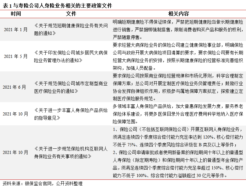 2021年以來(lái)監(jiān)管制度體系進(jìn)一步完善,引導(dǎo)行業(yè)持續(xù)回歸保障本源。人身險(xiǎn)業(yè)務(wù)方面,監(jiān)管機(jī)構(gòu)明確短期健康險(xiǎn)不得保證續(xù)保,嚴(yán)禁把短期健康險(xiǎn)當(dāng)做長(zhǎng)期健康險(xiǎn)進(jìn)行銷(xiāo)售;提出進(jìn)一步豐富人身險(xiǎn)產(chǎn)品供給,加大普惠保險(xiǎn)發(fā)展力度;規(guī)范互聯(lián)網(wǎng)人身保險(xiǎn)業(yè)務(wù)市場(chǎng)秩序,基于保險(xiǎn)產(chǎn)品類(lèi)別對(duì)網(wǎng)銷(xiāo)人身險(xiǎn)產(chǎn)品的公司設(shè)定了分檔的償付能力要求。此外,銀保監(jiān)會(huì)人身保險(xiǎn)監(jiān)管部建立了人身保險(xiǎn)產(chǎn)品“負(fù)面清單”機(jī)制,2022版負(fù)面清單在2021版負(fù)面清單的基礎(chǔ)上進(jìn)一步擴(kuò)容,新增了增額終身壽險(xiǎn)的保額遞增比例超過(guò)定價(jià)利率、醫(yī)療保險(xiǎn)條款混淆“惡性腫瘤”和“惡性腫瘤-重度”概念、短期健康保險(xiǎn)產(chǎn)品條款中關(guān)于不保證續(xù)保的表述不符合監(jiān)管規(guī)定等問(wèn)題,保險(xiǎn)產(chǎn)品監(jiān)管的透明度和有效性提升。
