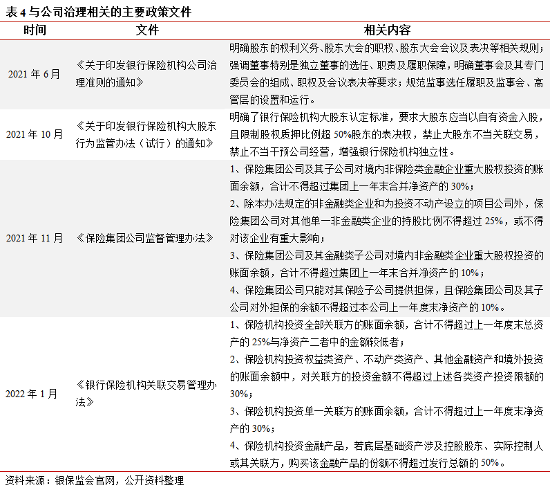 公司治理方面,2021年監(jiān)管機(jī)構(gòu)發(fā)布公司治理準(zhǔn)則,明確各治理主體的職責(zé)邊界、履職要求;出臺(tái)銀保機(jī)構(gòu)大股東新規(guī),明確了銀行保險(xiǎn)機(jī)構(gòu)大股東認(rèn)定標(biāo)準(zhǔn),規(guī)范大股東行為;加強(qiáng)保險(xiǎn)集團(tuán)公司治理監(jiān)管,新增完善了集中度風(fēng)險(xiǎn)管理、對(duì)外擔(dān)保管理等具體監(jiān)管要求;明確銀保機(jī)構(gòu)關(guān)聯(lián)方及關(guān)聯(lián)交易認(rèn)定標(biāo)準(zhǔn),對(duì)與資金相關(guān)的高風(fēng)險(xiǎn)關(guān)聯(lián)交易設(shè)定比例限額,防范向大股東提供融資的亂象問(wèn)題,有助于行業(yè)規(guī)范發(fā)展。