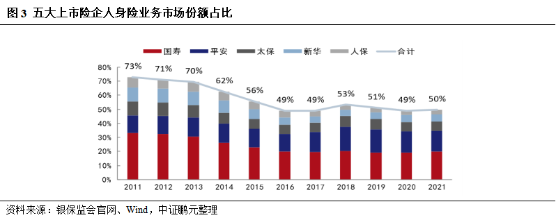 根據(jù)銀保監(jiān)會(huì)公布的《保險(xiǎn)機(jī)構(gòu)法人名單》,截至2021年12月末,人身險(xiǎn)公司共75家,健康險(xiǎn)公司共7家,養(yǎng)老保險(xiǎn)公司共9家。從行業(yè)競(jìng)爭(zhēng)情況來(lái)看,2011年以來(lái)五大上市險(xiǎn)企人身險(xiǎn)業(yè)務(wù)市場(chǎng)份額占比波動(dòng)下降,隨著互聯(lián)網(wǎng)渠道和經(jīng)紀(jì)渠道的快速發(fā)展,中小壽險(xiǎn)公司在業(yè)務(wù)轉(zhuǎn)型過(guò)程中,其產(chǎn)品憑借一定的價(jià)格優(yōu)勢(shì),觸達(dá)客戶(hù)的能力有所增強(qiáng),行業(yè)競(jìng)爭(zhēng)加劇;但總體來(lái)看,頭部險(xiǎn)企依托于品牌影響力、對(duì)銷(xiāo)售渠道的控制力、較強(qiáng)的產(chǎn)品設(shè)計(jì)和定價(jià)能力等方面優(yōu)勢(shì),仍維持相對(duì)較高的市場(chǎng)份額。