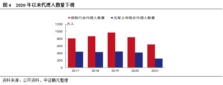 中證鵬元預(yù)計(jì)代理人規(guī)模仍有進(jìn)一步下降可能性,對(duì)2022年新單保費(fèi)增長(zhǎng)帶來(lái)一定壓力。受人口紅利的逐漸消退、壽險(xiǎn)行業(yè)轉(zhuǎn)型倒逼壽險(xiǎn)公司重視代理人隊(duì)伍質(zhì)量建設(shè)等因素影響,代理人規(guī)模自2019年達(dá)到頂峰后,開(kāi)始出現(xiàn)持續(xù)下滑,2021年末代理人合計(jì)641.9萬(wàn)人,較2020年末下降23.86%。近期監(jiān)管機(jī)構(gòu)對(duì)銷(xiāo)售環(huán)節(jié)的檢查力度進(jìn)一步加強(qiáng),2021年11月《人身保險(xiǎn)銷(xiāo)售管理辦法(征求意見(jiàn)稿)》征求意見(jiàn),擬實(shí)施保險(xiǎn)銷(xiāo)售人員分級(jí)管理、不允許自保件和互保件參與考核、限制傭金比例等,預(yù)計(jì)代理人規(guī)模仍有進(jìn)一步下降可能性,對(duì)2022年新單保費(fèi)增長(zhǎng)帶來(lái)一定壓力。