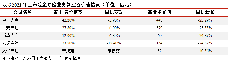 在新單保費(fèi)增長(zhǎng)乏力的背景下,新業(yè)務(wù)價(jià)值率下滑,新業(yè)務(wù)價(jià)值承壓。從新業(yè)務(wù)價(jià)值率來(lái)看,已披露2021年新業(yè)務(wù)價(jià)值率的4家上市險(xiǎn)企新業(yè)務(wù)價(jià)值率均同比下滑,主要有產(chǎn)品價(jià)格和產(chǎn)品結(jié)構(gòu)兩方面原因:產(chǎn)品價(jià)格方面,在行業(yè)下行的背景下,壽險(xiǎn)公司競(jìng)爭(zhēng)加劇,產(chǎn)品價(jià)格下調(diào);產(chǎn)品結(jié)構(gòu)方面,客戶(hù)購(gòu)買(mǎi)力下降,對(duì)保障型產(chǎn)品需求降低,重疾銷(xiāo)售難度大幅提升,在行業(yè)整體轉(zhuǎn)型困難的背景下,為維持保費(fèi)規(guī)模的穩(wěn)定,部分壽險(xiǎn)公司不得不擴(kuò)大低價(jià)值率的儲(chǔ)蓄型產(chǎn)品銷(xiāo)售比例,使得新業(yè)務(wù)價(jià)值率明顯下滑。此外,新舊重疾定義切換后,新業(yè)務(wù)價(jià)值率較高的重疾險(xiǎn)業(yè)務(wù)整體價(jià)值率有所下降,給新業(yè)務(wù)價(jià)值的增長(zhǎng)帶來(lái)壓力。從新業(yè)務(wù)價(jià)值來(lái)看,2021年5家上市險(xiǎn)企新業(yè)務(wù)價(jià)值均同比下滑,在新單保費(fèi)增長(zhǎng)乏力、新業(yè)務(wù)價(jià)值率下滑的環(huán)境下,未來(lái)新業(yè)務(wù)價(jià)值承壓。