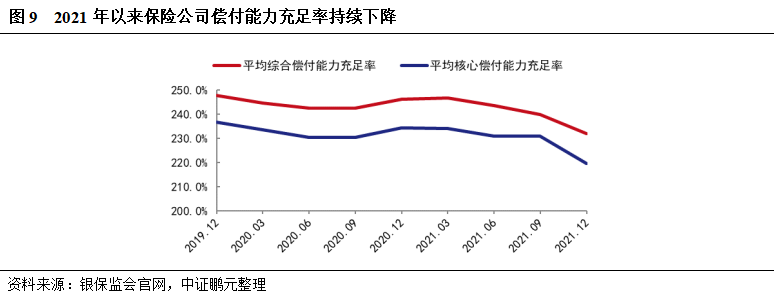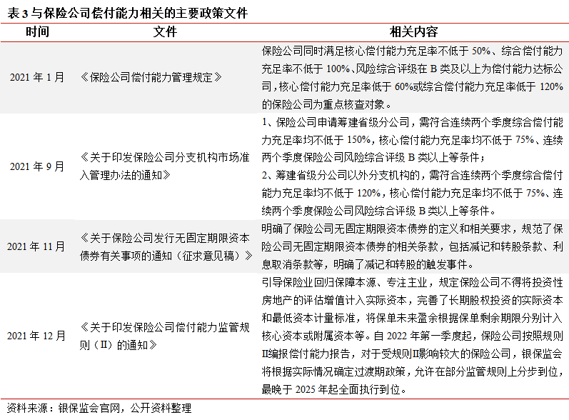 (4) 2022年起償二代二期工程正式實(shí)施,對(duì)險(xiǎn)企資本認(rèn)定趨嚴(yán),行業(yè)整體償付能力充足性水平或?qū)⒗^續(xù)下滑,部分險(xiǎn)企面臨資本補(bǔ)充壓力。