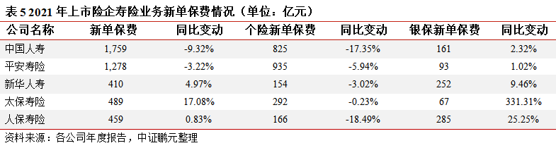 受疫情、代理人規(guī)模下降、普惠型產(chǎn)品沖擊以及保險(xiǎn)購(gòu)買(mǎi)力下降影響,新單保費(fèi)增長(zhǎng)乏力。從5家上市險(xiǎn)企來(lái)看,2021年中國(guó)人壽、平安壽險(xiǎn)新單保費(fèi)分別同比下降9.32%、3.22%,主要系個(gè)險(xiǎn)新單保費(fèi)明顯下降;新華人壽、太保壽險(xiǎn)和人保壽險(xiǎn)新單保費(fèi)實(shí)現(xiàn)正增長(zhǎng),主要系其加大了銀保渠道業(yè)務(wù)拓展力度、銀保新單保費(fèi)明顯增長(zhǎng)。值得注意的是,2021年5家上市險(xiǎn)企個(gè)險(xiǎn)新單保費(fèi)均較2020年有所下降,拖累整體新單保費(fèi)增長(zhǎng)。考慮到疫情帶來(lái)的收入不確定性使得居民的保險(xiǎn)購(gòu)買(mǎi)力下降,“惠民保”等價(jià)格較低的城市定制型醫(yī)療報(bào)銷(xiāo)型產(chǎn)品對(duì)商業(yè)重疾險(xiǎn)需求有一定的擠出效應(yīng),且短期內(nèi)代理人效能提升帶來(lái)的正面影響不抵代理人規(guī)模下滑帶來(lái)的負(fù)面影響,新單保費(fèi)規(guī)模增長(zhǎng)乏力。