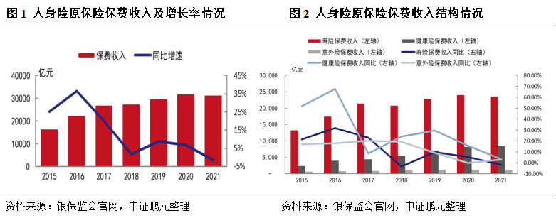 受監(jiān)管政策持續(xù)加碼、壽險(xiǎn)行業(yè)轉(zhuǎn)型、疫情沖擊、居民購(gòu)買(mǎi)力下降等因素影響,近年來(lái)人身險(xiǎn)原保險(xiǎn)保費(fèi)收入增速波動(dòng)下滑,2021年首次呈現(xiàn)負(fù)增長(zhǎng)。從結(jié)構(gòu)來(lái)看,健康險(xiǎn)保費(fèi)收入保持增長(zhǎng)但增速放緩,占總保費(fèi)收入比重由2015年的14.80%增長(zhǎng)至2021年的25.42%,產(chǎn)品結(jié)構(gòu)持續(xù)調(diào)整,隨著居民健康保障意識(shí)的不斷提高,健康險(xiǎn)保費(fèi)收入規(guī)模及占比有望繼續(xù)提升。