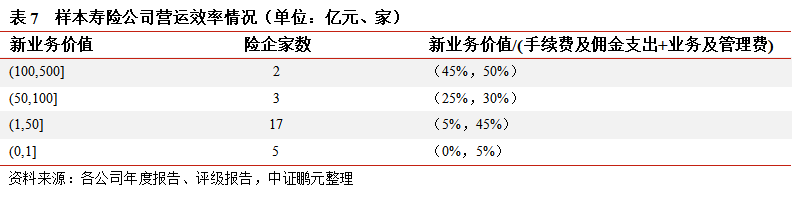 營(yíng)運(yùn)效率方面,本文以已披露2020年新業(yè)務(wù)價(jià)值的27家發(fā)債壽險(xiǎn)公司作為樣本,采用新業(yè)務(wù)價(jià)值/(手續(xù)費(fèi)及傭金支出+業(yè)務(wù)及管理費(fèi))來(lái)評(píng)價(jià)各壽險(xiǎn)公司營(yíng)運(yùn)效率。從下表來(lái)看,頭部險(xiǎn)企憑借廣泛的網(wǎng)點(diǎn)、品牌影響力以及保費(fèi)規(guī)模較大對(duì)固定成本的攤薄優(yōu)勢(shì),營(yíng)運(yùn)效率明顯優(yōu)于其他中小險(xiǎn)企,更容易實(shí)現(xiàn)承保盈利。