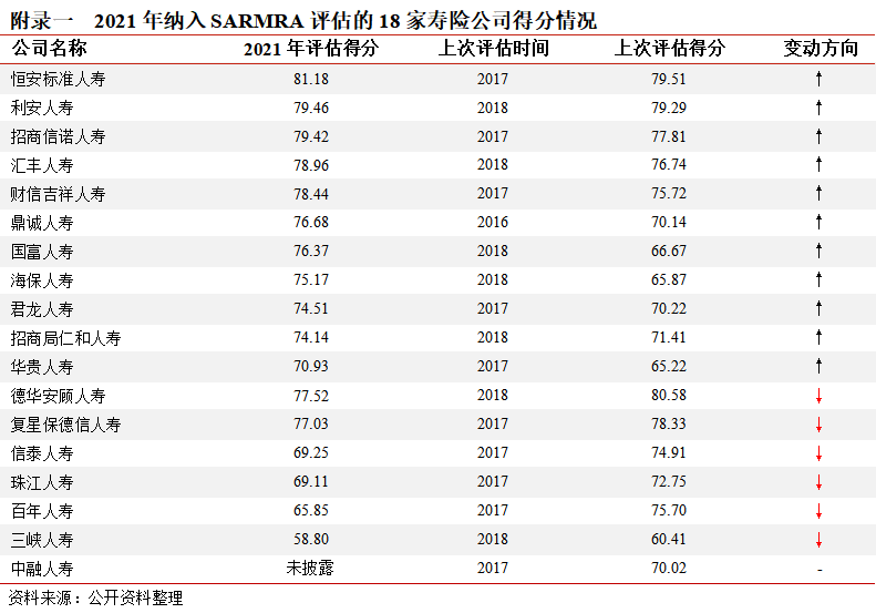 根據(jù)銀保監(jiān)會(huì)披露的2021年SARMRA評(píng)估結(jié)果[1],納入評(píng)估的18家壽險(xiǎn)公司平均得分為72.85分,較上期評(píng)估提高0.4分,從得分分布情況看,80分以上的壽險(xiǎn)公司僅1家,70分到80分的公司有12家,占比為66.67%,具體見(jiàn)附錄一,其中11家壽險(xiǎn)公司2021年SARMRA評(píng)估較上期評(píng)估得分提高,6家下降,還有1家尚未披露得分。2021年SARMRA評(píng)估得分上升的壽險(xiǎn)公司可以少計(jì)提最低資本,并提升后續(xù)償付能力充足率。