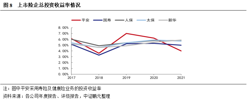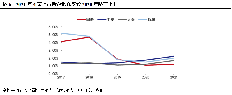 退保率方面,隨著中短存續(xù)期產(chǎn)品的逐步到期,2018年以來(lái)行業(yè)退保率整體呈下降趨勢(shì),但2021年5家上市險(xiǎn)企中有4家退保率較2020年略有上升。盡管近年來(lái)退保率整體下降,但仍面臨一定挑戰(zhàn):代理人規(guī)模收縮,導(dǎo)致相關(guān)自保件退保;在居民理財(cái)方式持續(xù)多元化的沖擊下,儲(chǔ)蓄型產(chǎn)品的發(fā)展空間受到了一定擠壓;在“惠民保”等醫(yī)療險(xiǎn)迅速發(fā)展的背景下,為減輕繳費(fèi)壓力,部分長(zhǎng)期險(xiǎn)客戶(hù)選擇退長(zhǎng)保短,都將為各險(xiǎn)企帶來(lái)一定的退保壓力。整體來(lái)看,未來(lái)各險(xiǎn)企退保率變化情況仍需關(guān)注。