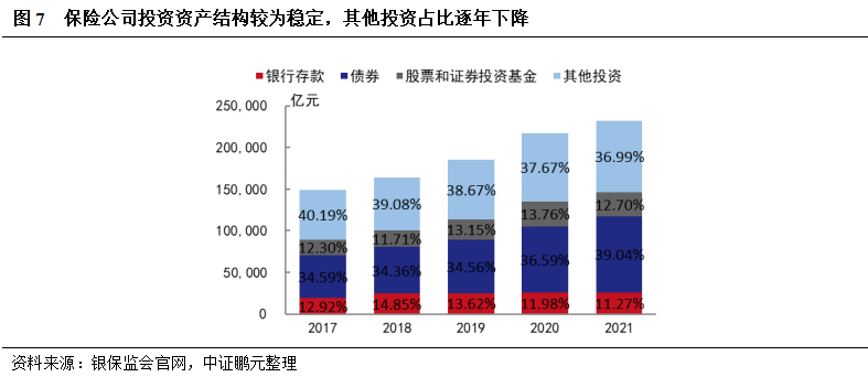 保險(xiǎn)行業(yè)資金運(yùn)用余額保持增長(zhǎng),投資端政策松綁,未來(lái)可投資領(lǐng)域擴(kuò)大;投資資產(chǎn)結(jié)構(gòu)較為穩(wěn)定,債券及其他投資占比超七成,監(jiān)管機(jī)構(gòu)引導(dǎo)保險(xiǎn)資金加大標(biāo)準(zhǔn)化產(chǎn)品投資,未來(lái)非標(biāo)產(chǎn)品占比或?qū)⑾陆?/p>