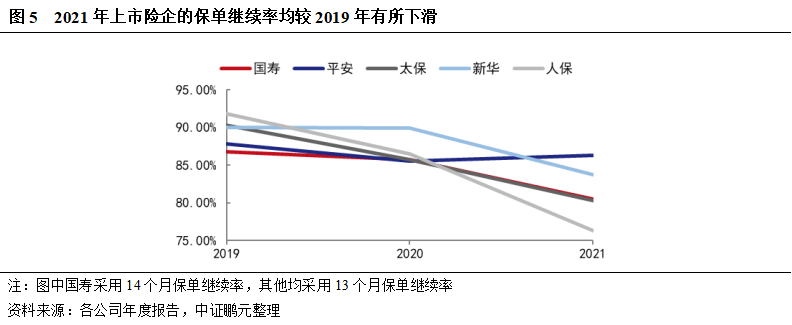 保單繼續(xù)率持續(xù)下滑,未來(lái)續(xù)期保費(fèi)對(duì)保費(fèi)增長(zhǎng)的拉動(dòng)作用有待觀察。從保單繼續(xù)率看,2021年5家上市險(xiǎn)企的保單繼續(xù)率均較2019年有所下滑,在壽險(xiǎn)行業(yè)轉(zhuǎn)型調(diào)整的背景下,代理人渠道改革的推進(jìn)使得低質(zhì)量代理人脫落,與之對(duì)應(yīng)的存量保單也會(huì)受到影響,疊加疫情影響,代理人線(xiàn)下面訪(fǎng)受限,部分客戶(hù)因經(jīng)濟(jì)問(wèn)題未續(xù)保,拉低了保單繼續(xù)率。2022年代理人渠道改革仍在繼續(xù),疫情尚未得到完全控制,續(xù)期保費(fèi)對(duì)保費(fèi)增長(zhǎng)的支撐作用有待觀察。