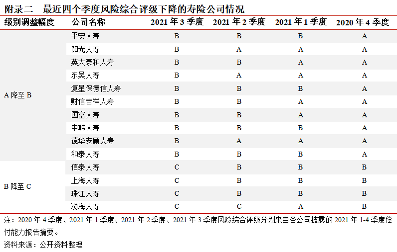 截至2021年三季度末,共有6家壽險(xiǎn)公司風(fēng)險(xiǎn)綜合評(píng)級(jí)為C類(lèi),分別為前海人壽、信泰人壽、合眾人壽、上海人壽、渤海人壽和珠江人壽,其中前海人壽、合眾人壽風(fēng)險(xiǎn)綜合評(píng)級(jí)連續(xù)4個(gè)季度為C類(lèi)。據(jù)中證鵬元統(tǒng)計(jì),最近一期風(fēng)險(xiǎn)綜合評(píng)級(jí)較2020年四季度出現(xiàn)下降的壽險(xiǎn)公司共14家,其中10家的風(fēng)險(xiǎn)綜合評(píng)級(jí)由A降至B,4家的風(fēng)險(xiǎn)綜合評(píng)級(jí)由B降至C;上升的共9家,其中小康人壽風(fēng)險(xiǎn)綜合評(píng)級(jí)由D上升至B,主要受益于引入新股東并增加注冊(cè)資本28億元,其他均為由B上升為A,具體見(jiàn)附錄二。風(fēng)險(xiǎn)綜合評(píng)級(jí)為C類(lèi)或D類(lèi)的公司,主要風(fēng)險(xiǎn)來(lái)自公司治理、資金運(yùn)用、操作風(fēng)險(xiǎn)等方面,償付能力不達(dá)標(biāo)將對(duì)保險(xiǎn)公司后續(xù)保險(xiǎn)、投資等多項(xiàng)業(yè)務(wù)的開(kāi)展造成較大負(fù)面影響。