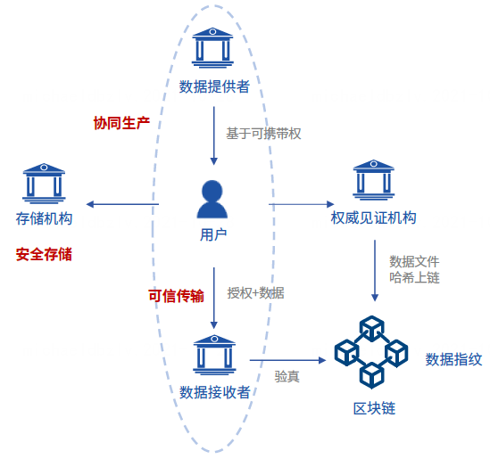第一步是用戶從數據提供者處下載個人信息數據,并存儲在個人指定的位置。存儲位置可以是本地,也可以是云或其它位置。為了確保個人真實意愿、防止真實數據被篡改、保持傳輸給接收者的個人信息與提供者提供的個人信息一致,經用戶授權后,可進一步引入權威中立的第三方機構參與見證該個人數據文件的傳輸過程,并獲取相關文件的哈希值(而非源文件)作為“數據指紋”存儲于區塊鏈上。第二步是用戶將已下載的個人信息數據傳輸給數據接收者,并對使用范圍和使用目的等進行授權。數據接收者在收到個人信息數據文件之后,可以將該文件與此前存儲于區塊鏈上的“數字指紋”進行比對,從而完成驗真的過程。與此同時,個人的所有授權記錄、數據接收者的具體使用情況也皆可在鏈上進行記錄,便于個人未來追溯相關文件的流轉。