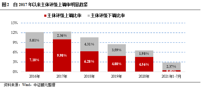 同時,我國評級機構在上調(diào)級別方面已趨于謹慎。2016-2021年級別調(diào)整率表明,自2017年以來我國發(fā)債主體的評級上調(diào)率已明顯下降,2021年截至目前更是低至0.45%(圖2)。2018-2021年的上調(diào)/下調(diào)比率也從2018年的1.46下降至2021年的0.19,整體呈下降趨勢。