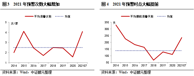 此外,我們觀察到,2018-2020年均有違約當日才進行首次級別下調(diào)的情況,造成級別斷崖式下降。其中,2018年有5家,2019年和2020年各1家,在2021年截至目前尚未發(fā)生。這也反映出,評級機構也在不斷地調(diào)整評級機制,避免這種毫無預警的斷崖式下調(diào)。二、預警次數(shù)顯著增加,預警時間大幅提前