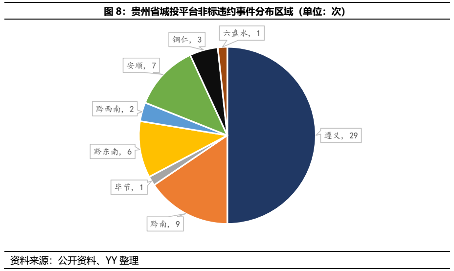 前文已提到,貴州債務問題十分突出,政府債務余額與存續債城投有息債務之和達27,088.62億元,是其GDP的1.5倍,YY-Ratio也達到822.8666%,全國第一。除此之外,貴州更是非標違約的重災區,據不完全統計,截至目前貴州發生的城投平臺非標違約事件至少已達58起,除貴陽外,其余8個市州均有涉及,以遵義、黔南最為集中,違約主體涵蓋市級平臺和區縣級平臺。頻發的非標違約事件,又給貴州區域形象蒙上了一層陰影。