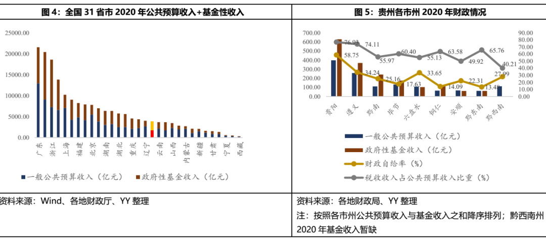 2020年,貴州省一般公共預算收入1,786.78億元,同比增長1.1%,其中稅收收入1,086.02億元,占比60.78%,收入質量和穩定性偏低;同年一般公共預算支出5,723.27億元,以一般公共預算收入/一般公共預算支出來衡量的財政自給率僅為31%;政府性基金收入2,047.12億元,同比增長19.6%,其中土地使用權轉讓收入1,860.92億元,對賣地收入依賴很大;另有中央轉移支付3,258.6億元,在貴州的財政體系中對上級依賴很大。