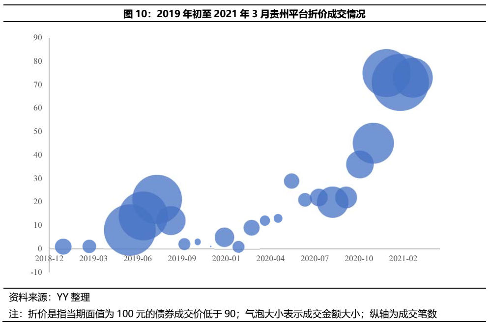 進一步看,2019年初至2021年3月,貴州省內共有31家平臺所發債券被打折成交,遍布貴州省內全部9個市州,除南部三個自治州各有1家外,其余各市在3-6家不等;若考慮基數,則銅仁(4/7)、畢節(6/10)折價平臺占平臺總數比重最高,超50%。