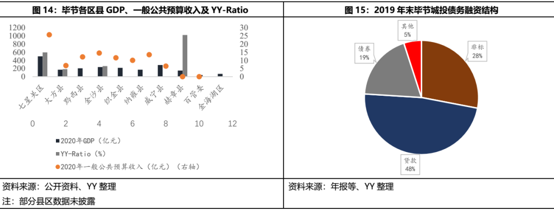 從顯性數據來看,畢節市在貴州省內整體資質其實相對較好,GDP、公共預算收入以及債務水平(由輕到重排序)均位列第三,磷礦、煤炭、鐵礦、稀土礦等儲量豐富,火電生產能力強,具備一定產業支撐,還是全省人口第一大市,扶貧支持力度也很大。饒是如此,以畢節2,000億的GDP、130億的一般公共預算收入來支撐10家平臺仍是顯得有些不般配。區縣看,七星關區綜合實力最強,赫章縣GDP和財政收入規模最小、債務負擔最重,其余區縣差距不大。融資結構看,畢節城投的非標融資占比為28%,從絕對水平上來看偏高,但在貴州省內處于中游水平。