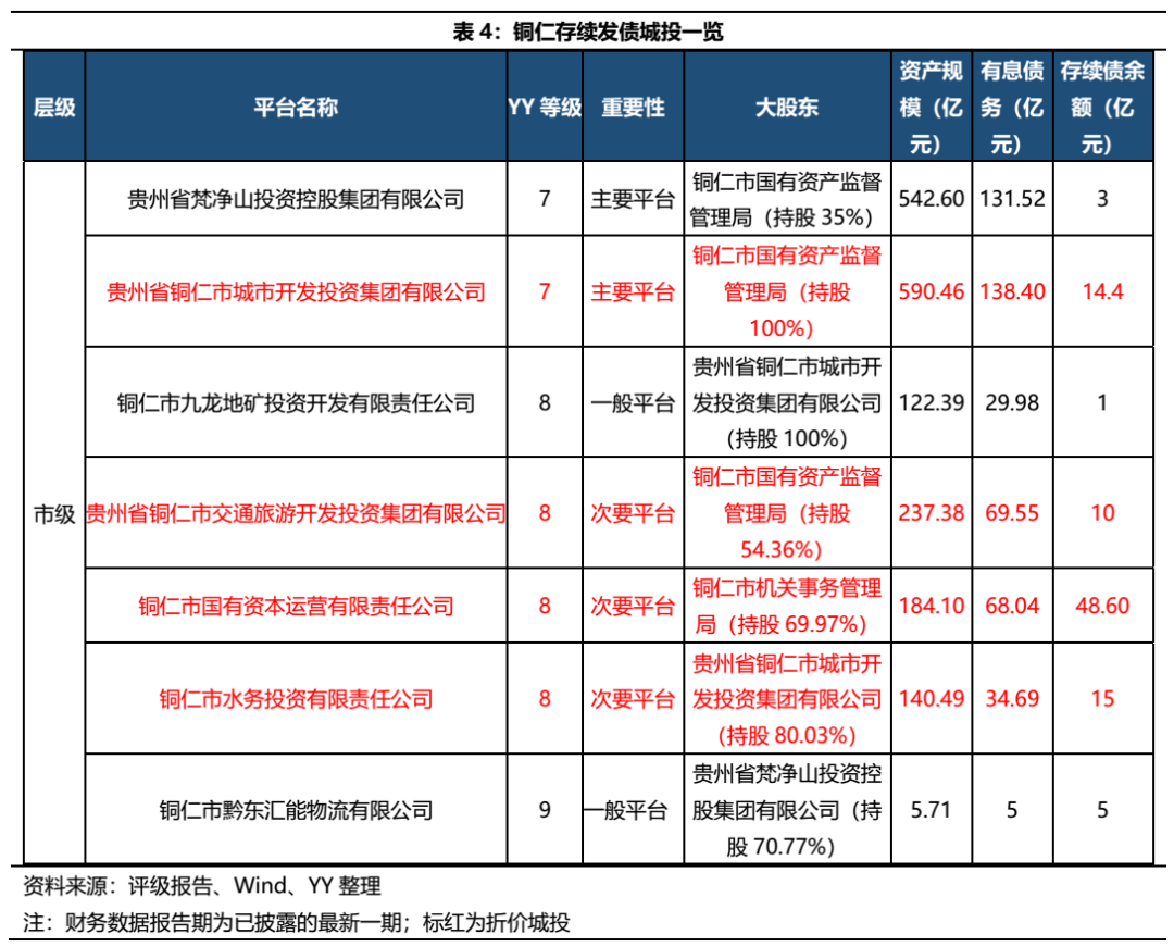 貴州省銅仁市城市開發投資集團有限公司、貴州省銅仁市交通旅游開發投資集團有限公司、銅仁市國有資本運營有限責任公司目前只有存續私募債,公開披露信息極少;銅仁市水務投資有限責任公司是銅仁城開投的子公司,負責銅仁市的水務業務及部分土地開發和基建業務,雖不存在明顯負面,但整體規模較小,償債資金缺口較大。