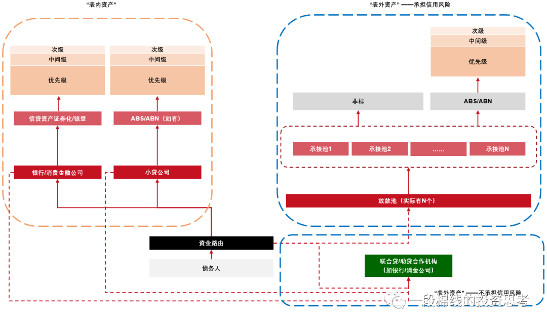 通過體系內(nèi)作為非金融企業(yè)的小貸公司,或作為金融機(jī)構(gòu)的銀行/消費(fèi)金融公司發(fā)放全部或部分(針對聯(lián)合貸)貸款。在不同主體下的貸款可以通過叫做”交易所企業(yè)資產(chǎn)證券化“、”信貸資產(chǎn)證券化“或”銀登結(jié)構(gòu)化“等不同名字的證券化產(chǎn)品進(jìn)行再融資。