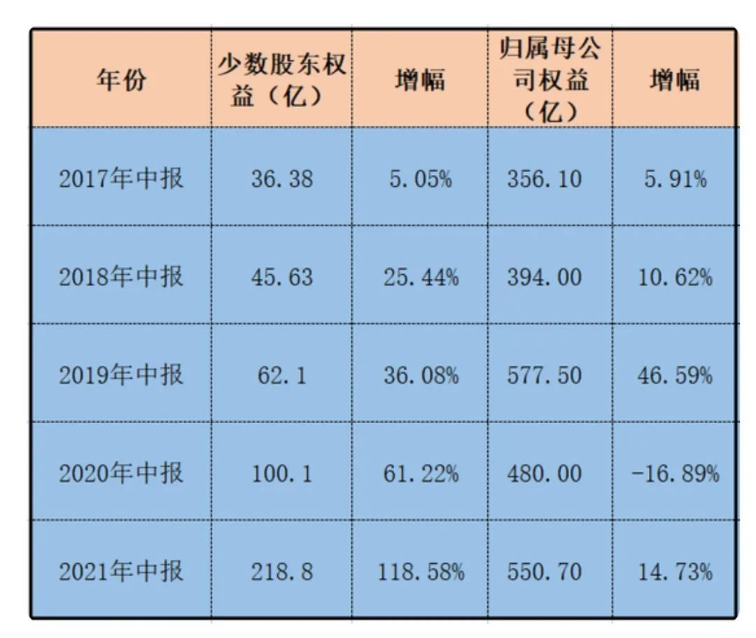 2017年到今年上半年,雅居樂的少數(shù)股東權(quán)益一路飆增,分別達(dá)到23.1億、54.1億、73.0億、125.2億、218.83億。
