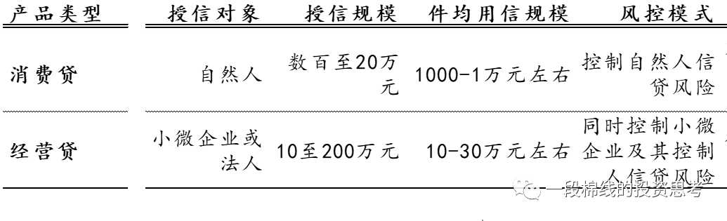 為一線貸款機(jī)構(gòu)的潛質(zhì);在經(jīng)營貸領(lǐng)域,具備判斷客戶信用風(fēng)險的獨(dú)特數(shù)據(jù)來源,并穩(wěn)定占有100萬名高復(fù)貸率小微客戶的機(jī)構(gòu)具備成為一線貸款機(jī)構(gòu)的潛質(zhì)。