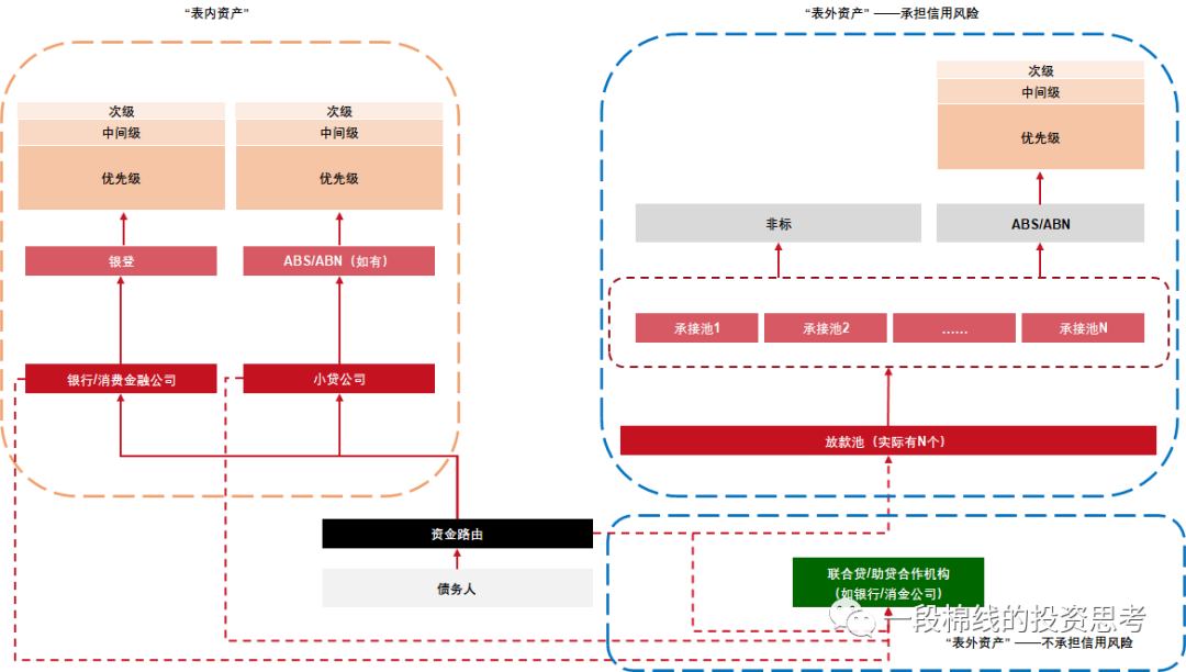 1)零售信貸行業(yè)完整的“資產(chǎn)負(fù)債表”應(yīng)該囊括所有實(shí)際承擔(dān)信用風(fēng)險、賺取超額收益的資產(chǎn)及負(fù)債(應(yīng)并入實(shí)際抽走超額收益并隱含承擔(dān)還款義務(wù)的金融產(chǎn)品);