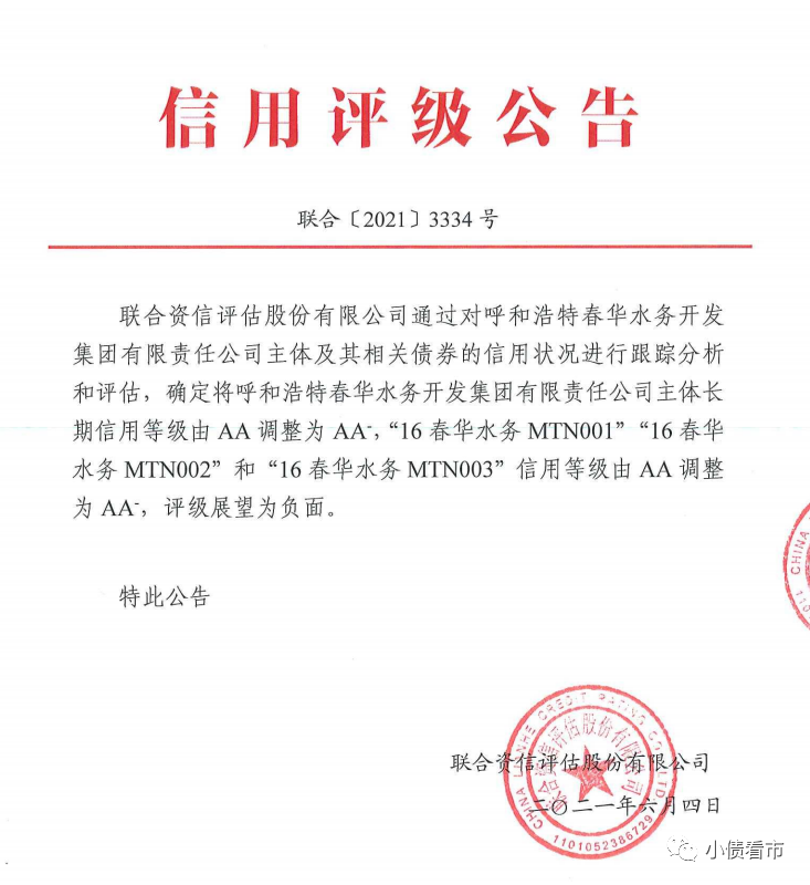 6月4日,聯(lián)合資信公告稱,將呼和浩特春華水務(wù)開發(fā)集團有限責(zé)任公司(以下簡稱“春華水務(wù)”)主體和相關(guān)債項信用等級由AA調(diào)整為AA-,評級展望為負面。