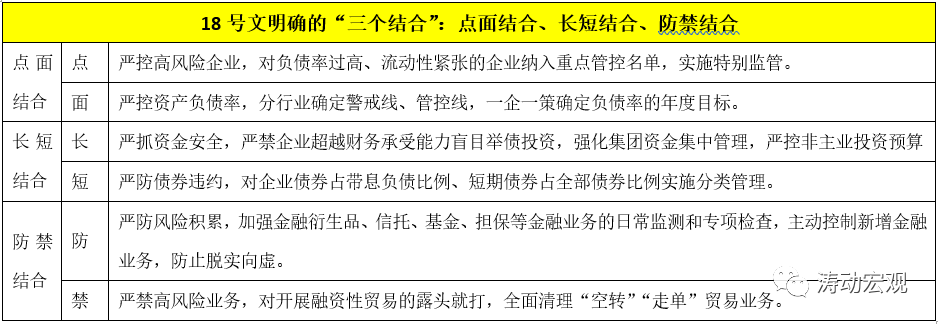 (二)考慮到3號(hào)文延續(xù)了《關(guān)于國(guó)有企業(yè)資產(chǎn)負(fù)債約束的指導(dǎo)意見》的要求和精神,基本上可以被視為是18號(hào)文的配套細(xì)則,因此3號(hào)文的適用性亦可以進(jìn)一步推廣到河南省以外的地區(qū)。因此18號(hào)擬定的一些原則仍然值得關(guān)注,如下表所呈現(xiàn)的“三個(gè)結(jié)合”。