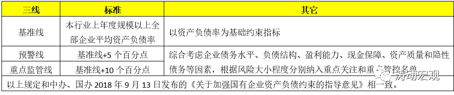 從具體內(nèi)容上看,3號(hào)文延續(xù)了《關(guān)于國(guó)有企業(yè)資產(chǎn)負(fù)債約束的指導(dǎo)意見》的要求和精神,很多內(nèi)容具有較好的契合性,如均提出按照基準(zhǔn)線、預(yù)警線和重點(diǎn)監(jiān)管線等三線進(jìn)行資產(chǎn)負(fù)債率管理,并相應(yīng)設(shè)定重點(diǎn)關(guān)注企業(yè)和重點(diǎn)監(jiān)管企業(yè)。
