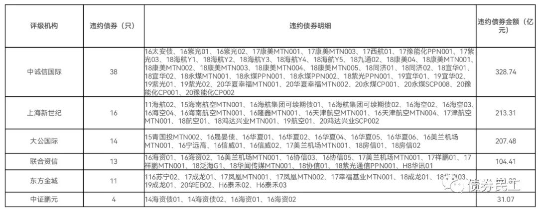 5、從違約信用債券的評級機構來看,各家評級機構的違約金額差別很大。因為違約債券的數量較多,債券民工對違約債券的評級機構做了不完全統計,具體數據見下表。