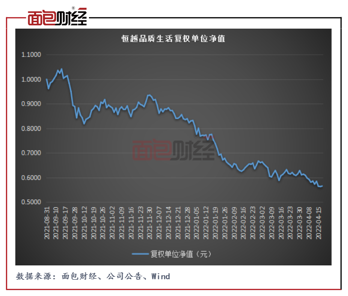 2022年年初至今,恒越品質生活復權單位凈值下跌32.08%。截至4月19日,在成立不足一年時間里,該基金復權單位凈值跌至0.5656元,凈值虧損較為嚴重。