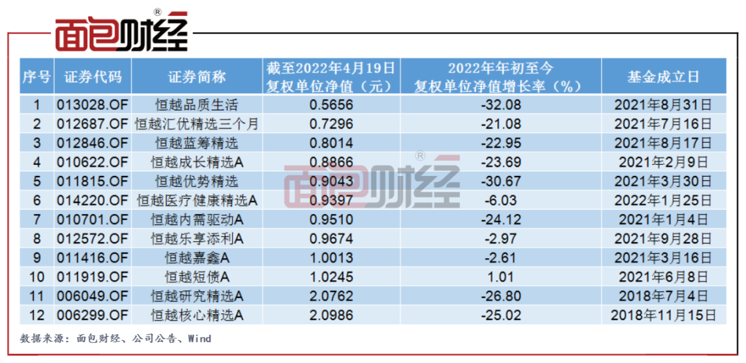 雖然恒越基金的管理規模大幅擴張,但基金產品的業績表現卻并不理想。2022年年初至今(截至2022年4月19日,下同),恒越基金在管的12只基金產品中,有8只產品復權單位凈值跌幅在20%以上,其中2只產品復權單位凈值跌幅超過30%。