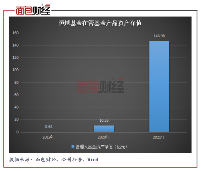 2021年以來,恒越基金的管理規模快速增加,突破100億元。截至2021年末,恒越基金旗下基金產品規模合計近147億元,較2020年末的10.55億元增加超過10倍,較2019年末的0.62億元增加超過200倍。