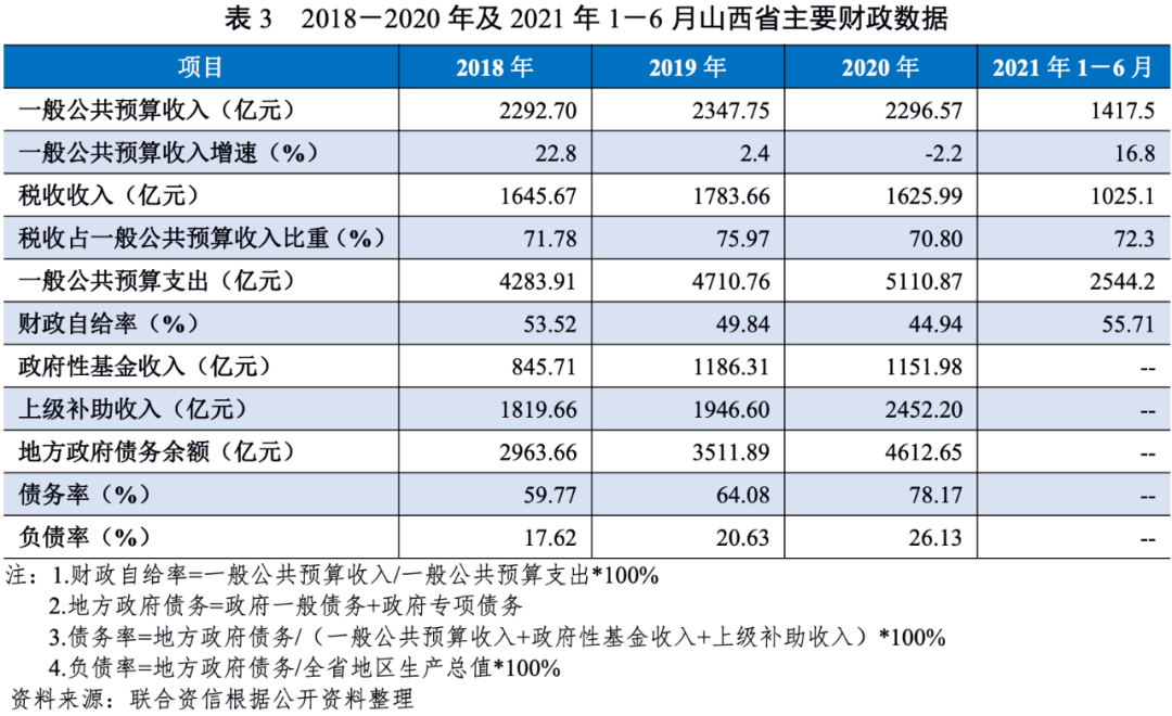 山西省自然資源稟賦良好,近年來經濟穩步發展,整體經濟發展水平處于全國下游,經濟總量及人均GDP在全國排名靠后。受新冠疫情影響,2020年山西省地區生產總值增速同比有所下降。2018-2020年,山西省第二產業占比波動上升,對煤炭產業依賴性強,在碳達峰和碳中和目標的背景下,山西省面臨較大的產業升級和結構調整壓力。2020年,山西省一般公共預算收入規模在全國排名第16位,稅收占比較高但財政自給程度一般,中央補助規模大且持續性好。2020年山西省政府負債率為26.13%,政府債務負擔較輕;山西省政府債務率為78.17%,償債能力較強。