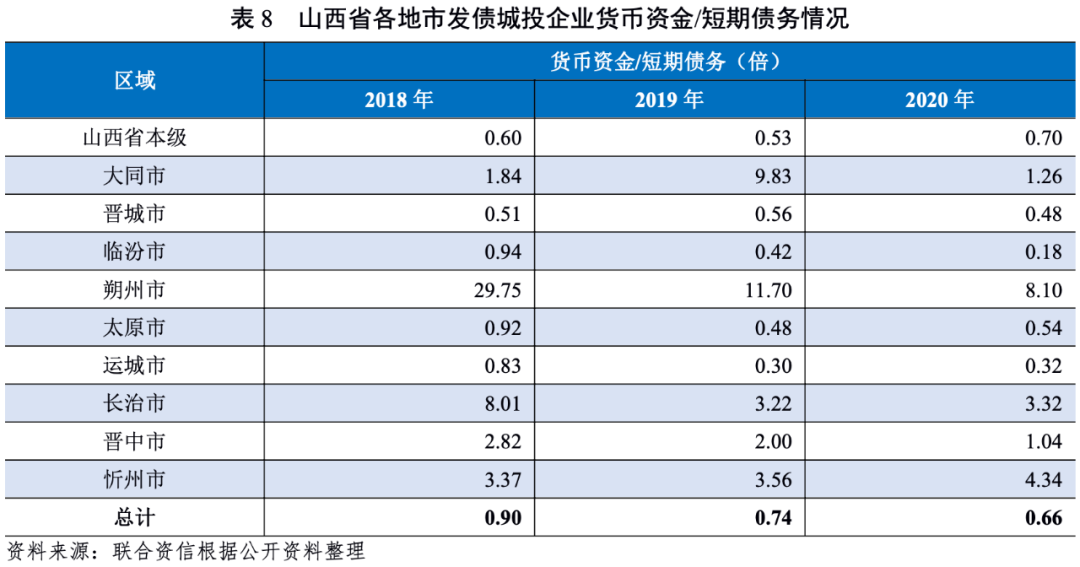 山西省大部分地市發債城投企業整體債務負擔較輕,由于購建固定資產和支付其他與投資有關的現金增加導致貨幣資金減少,各地市發債城投企業的短期償債能力指標多有所弱化;山西省各地市綜合財力對城投企業2022年到期債券的覆蓋能力較強,山西省各地市集中償付壓力較小。